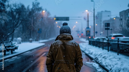 Person Walking Through Snowy City Street at Dusk with Streetlights, Snowflakes, and Cars in the Background
