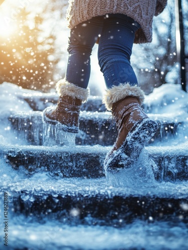 Person walking up snowy stairs in winter.