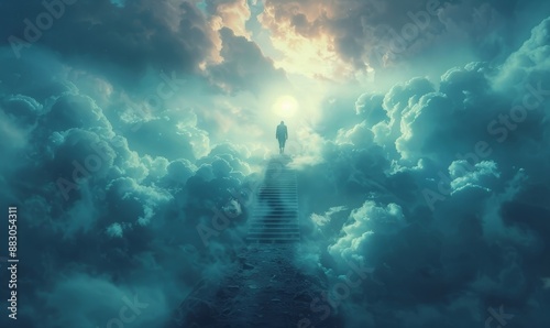 Person walking up stairway to heaven through clouds in the sky after death, Generative AI