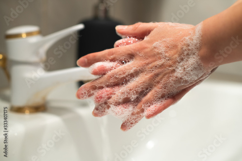Person washing hands in the bathroom. Washing hands with soap and water for coronavirus prevention. Hand washing is the cornerstone of infection control. Stop spreading Covid-19