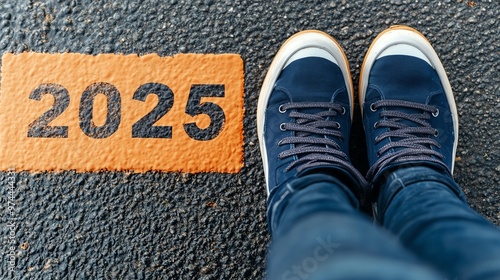 Person wearing blue sneakers standing next to a painted 2025 on the pavement, symbolizing future goals and progress.