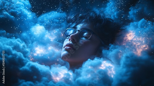 Person wearing wearable sleep tracker surrounded by dreamlike elements like stars and soft clouds symbolizing deep sleep and biohacking sleep tools