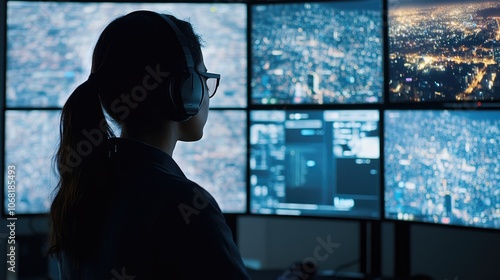 Person with Headset Analyzing Data on Multiple Screens
