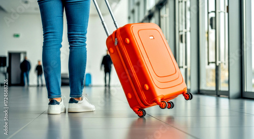 Person with Orange Suitcase Walking Through Airport Terminal.