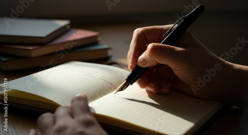 Person writing in journal with pen, morning light