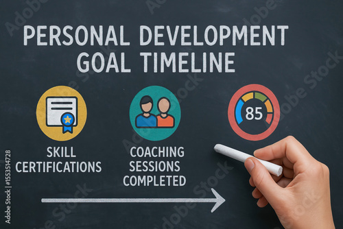 Personal development goal timeline concept on blackboard with icons for skill certification, coaching sessions completed, and progress, symbolizing invest in yourself.