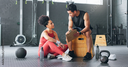 Personal trainer man, woman gym and exercise plan with.a fitness instructor training routine, body and healthy cardio sports workout. Athlete exercising, health wellness and strong mental motivation