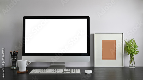 Personal workspace computer with blank screen, pencil holder, picture frame, potted plant, and coffee cup putting together on modern wooden table with white wall as background.
