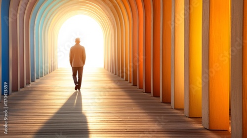 Personality disorder concept. A person walks through a colorful tunnel, illuminated by bright light at the end, creating a sense of journey and exploration.