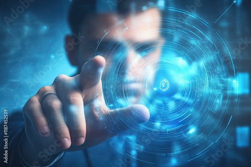 Person's finger interacts with glowing, digital interface.