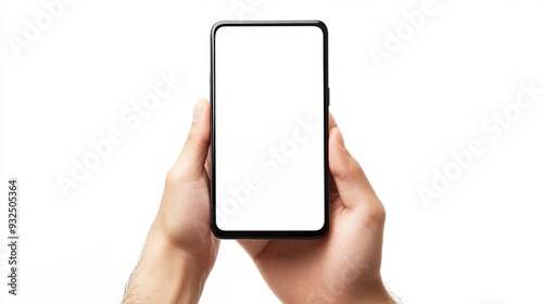 Person's palm exhibits mobile with white screen upright on plain backdrop mockup