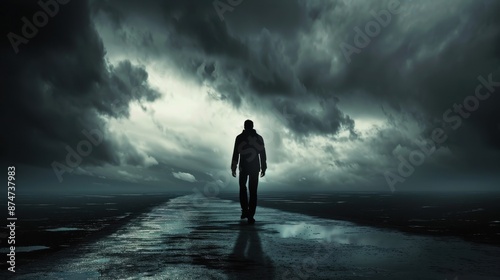Persons shadow walking away, dark gloomy sky in background, realistic imagery