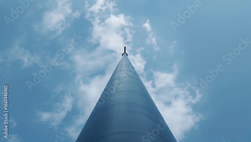 Perspective view of a tall metal structure pointing toward a blue sky with scattered clouds