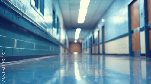 Perspective view of an empty hospital hallway with fluorescent lighting, conveying a clean and clinical atmosphere.