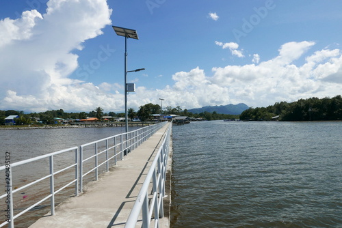 Perspective view of jetty with LED street light with solar cell on clear blue sky.