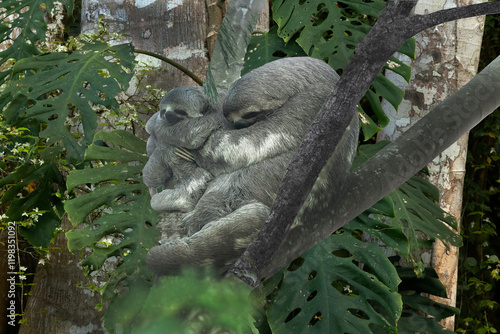 Peru, Amazon. Mother and baby two-toed sloth in tree.