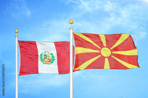 Peru and North Macedonia two flags on flagpoles and blue sky