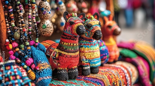 Peruvian souvenirs including small handwoven textiles, ceramic llamas, and colorful beaded jewelry.