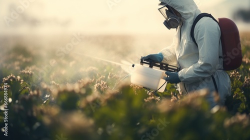 Pesticide and Fertilizer Application: "A farmer in protective gear spraying crops with a pesticide applicator.