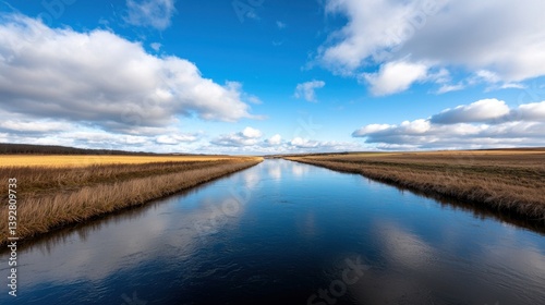 Pesticide farm Concept, Serene River Landscape with Agricultural Fields Under Bright Blue Sky and Wispy Clouds