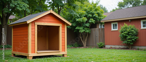 Pet adoption fair featuring an empty orange doghouse in a lush green backyard, surrounded by trees and a cozy home, conveying a sense of optimism and readiness for new pets
