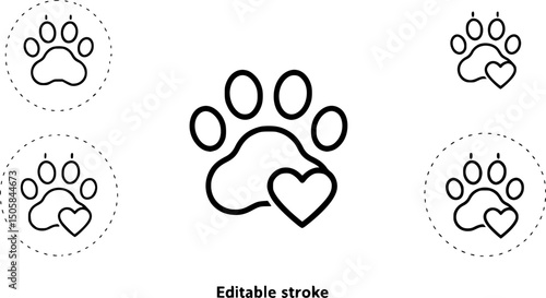 Pet paw editable stroke. footprints Pet paw, Heart with pet paw print dog cat icon, vector illustration