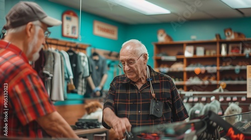 Pet shop employee helps elderly man select dog collar : Generative AI