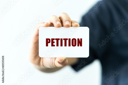 Petition text on blank business card being held by a woman's hand with blurred background. Business concept about petition.