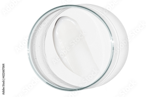 Petri dish isolated on empty background. A smear of cosmetic cream in a Petri dish.