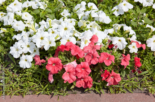Petunia, red and white Petunias in open ground. Lush blooming colorful common garden petunias in city park. Family name Solanaceae, Scientific name Petunia