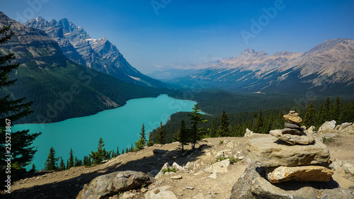 Peyto Lake in Alberta at Banff National Park in Canada with Glacier and Turquoise Green Water and Smoky Sky