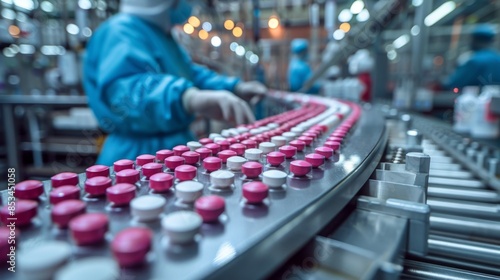 Pharmaceutical Manufacturing Line with Workers in Protective Gear and Red-White Pills on Conveyor Belt
