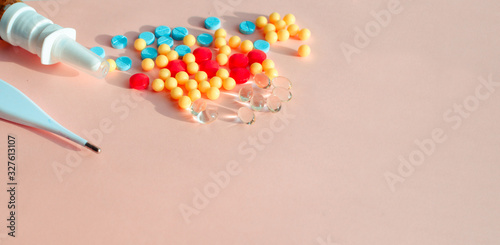 pharmaceutical pills thermometer a pink background. Copy space. the concept of health. concept of life. assorted medicines. bright pills. coronavirus