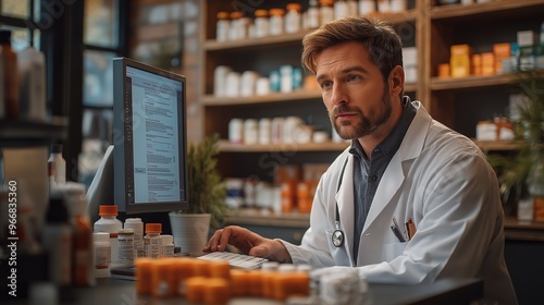 Pharmacist at work in a modern pharmacy, focused on a computer screen with medicine bottles on the desk, healthcare professional