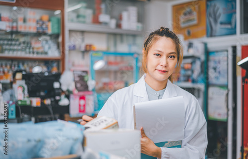 Pharmacist checking Checks Inventory of Medicine, Drugs, Vitamins with tablet and checking patient's prescription in modern pharmacy.
