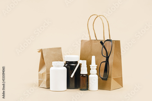pharmacy order delivery. prescription drugs and over the counter medication. Pills and spray mockup vial containers and buff paper bags. Glasses optitian. Drugstore shopping copy space