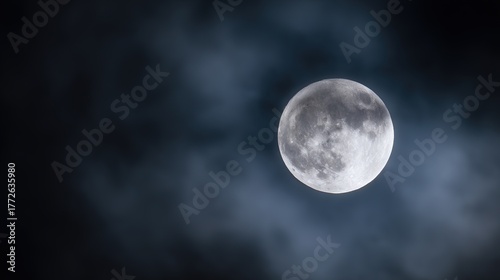 phase. Dramatic night sky featuring a full moon with subtle cloud details, evoking a serene celestial atmosphere. travel magazines, destination branding, designed for travel destination branding.