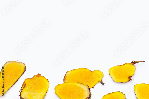 Phlai slices, Cassumumr ginger or zingiber montanum on white background.
