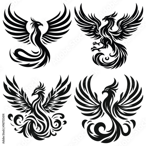 Phoenix tattoos vector illustration, black on white, symbolic of rebirth and resilience