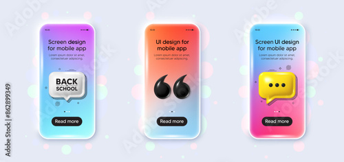 Phone 3d mockup gradient screen. Back to school tag. Education offer. End of vacation slogan. Back to school phone mockup message. 3d chat speech bubble. Yellow text box app. Vector