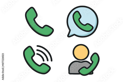 Phone call icons set. Vector cartoon telephone and mobile communication symbols. Collection of support, contact, and hotline signs. Ringing phone and user avatar pictogram.