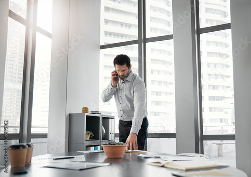 Phone call, schedule and planning with business man in office for communication, networking and contact. Real estate developer, property manager and consultant with person talking for negotiation