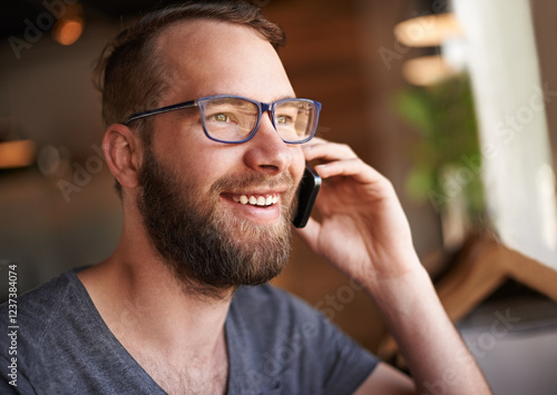 Phone call, thinking and smile with man in coffee shop for customer feedback, vendor inquiry and reservation. Restaurant order, entrepreneur and small business owner with person in cafe for vision