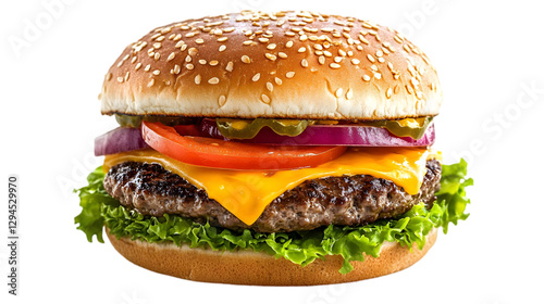 Photo - Delicious Cheeseburger with Beef Patty, Lettuce, Tomato, Onion, and Sesame Seed Bun