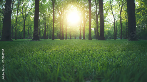 Photo - Lush Green Grass and Sunlit Trees in a Serene Forest