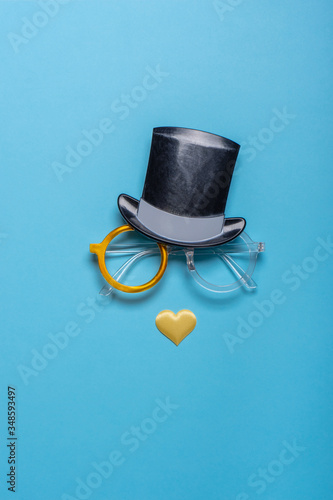 Photo booth props cylinder hat, glasses and nose of heart shape on blue background. Greeting card for father's day. Creative composition in minimal style, flat lay
