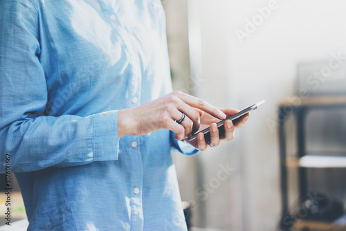 Photo business woman wearing jeans shirt, touching smartphone screen. Modern loft office. Blurred background, sunlight. Horizontal mockup. Film effect