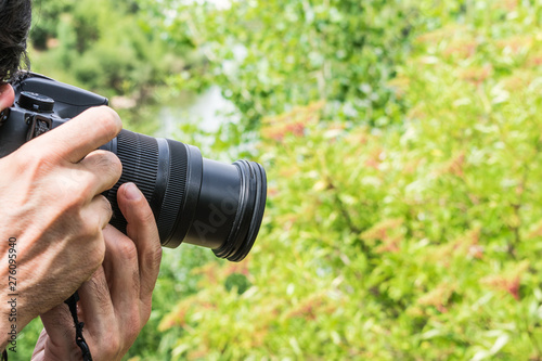 photo camera in photographer hand shooting