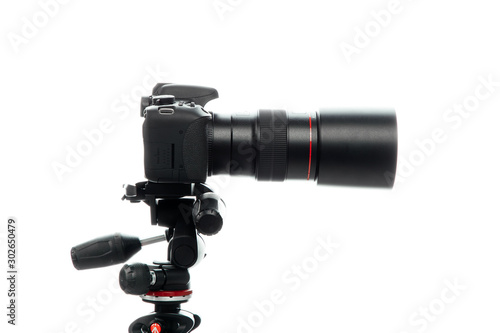 Photo camera with lens on the tripod. Studio shot on white isolate background