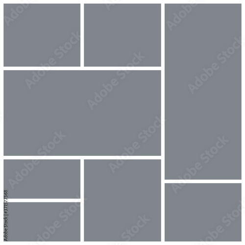 Photo collage grid. Square mood board template. Vector. Moodboard design. Mosaic frame banner. Branding presentation. Photography album layout. Gray pictures on white background. Simple illustration